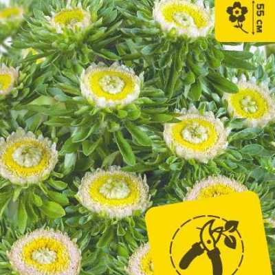 Неповторимые, привлекательные цветы зеленого цвета без лепестков с желто-белой сердцевиной, с хорошим ветвлением и обильным цветением. Высота 55-60 см. Астра с исключительной формой куста и экзотическим цветком. Идеальный сорт для срезки. Цветет с конца июля по сентябрь. Не зря астру называют королевой осеннего цветника: она красива, неприхотлива и продолжительно цветёт. Роскошные и яркие букеты из астр остаются свежими и радуют глаз более двух недель.