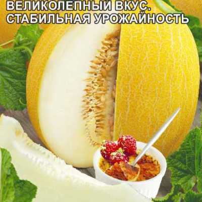 Дыня Крем Брюле - среднеспелый сорт, 60 - 75 дней от посева до сбора урожая. Урожайность 6 - 7 кг/кв.м, транспортабельный на дальние расстояния, хорошо сохраняет товарность. Выращивают в открытом грунте, парнике, теплице. Растение длинноплетистое. Плоды овальной формы, поверхность гладкая, желтого цвета с оранжевым оттенком. Дыньки созревают одна к одной – равномерно окрашены, желто-оранжевые, массой 1,3-1,8 кг. Мякоть кремовая, сладкая, очень ароматная тает во рту! Сорт имеет восхитительные вкусовые характеристики. Ароматная мякоть не оставляет дегустаторов равнодушными к этому сорту. Дыню употребляют в сыром виде, готовят варенье и соусы, дольки используют в десертах и в качестве гарнира к мясным стэйкам. Это не просто сладкий фрукт, а целый кладезь питательных минералов, витаминов А, Р, аскорбиновой кислоты.