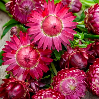 Гелихризиум Королевский размер - высокорослый сортов популярных сухоцветов, выращиваемых в однолетней культуре. Мощные ветвистые растения достигают 1 метра в высоту и образуют крупные цветки с корзинками до 8 см в диаметре, плотно окруженными сухими чешуйками-лепестками. Оригинальность соцветиям придают многорядные пленчатые листочки-обертки различной окраски. Массовое появление цветов начинается с июля и продолжается до наступления морозов. Растения хорошо сохраняют свою форму, цвет, иногда и аромат на протяжении длительного времени. Букеты или композиции из них украсят помещение и будут напоминать о лете. Великолепно смотрятся в миксбордерах в сочетании со злаками. Для зимних букетов цветоносы срезают в фазе неполного раскрытия бутона и высушивают, подвешивая вниз головками. После засушивания букеты из гелихризума способны простоять несколько лет, сохраняя естественный природный цвет и не теряя формы бутонов. Сухоцветы можно увидеть в природе - в лесу, в поле, у реки.