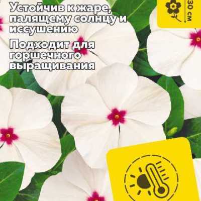 Катарантус Хит Вейв Пепперминт удивительное изящное и красивоцветущее растение, которое может украсить любой сад и дом. Его крупные белоснежные цветки размером 3-5 см с красно-малиновой серединкой распускаются в мае и радуют изящной красотой до сентября. Яркий тропический красавец отличается простотой выращивания и неприхотливостью. Многолетнее растение, устойчивое к засухе, длительной жаре и другим неблагоприятным внешним факторам. В российских широтах выращивается как однолетник. Растение формирует небольшие и компактные кусты высотой 20-30 см с густой, пышной кроной диаметром 25-30 см. Главное достоинство катарантуса Пепперминт – красочное и обильное цветение на протяжении всего сезона. Белоснежные соцветия безупречно смотрятся в подвесном кашпо, балконном ящике или контейнере. Хорош как почвопокровное растение, быстро разрастается, образуя густой и пышный цветущий ковер, становящийся главным украшением сада, его хорошо комбинировать с другими декоративными культурами.