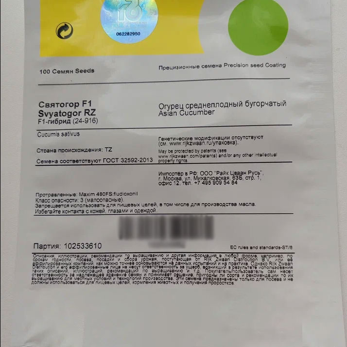 Огурец Святогор F1 - высокопродуктивный среднеспелый гибрид с бугорчатыми плодами средних размеров. Отличный выбор для тех, кто ценит свежие и вкусные овощи. Прекрасные характеристики и легкость выращивания делают его одним из самых востребованных сортов на рынке. Первые зеленцы созревают на 43-46 день после формирования саженцев. Соцветия женского типа, слабая ветвистость и небольшие ярко-зеленые листочки. Плоды вырастают до 17см с прекрасными вкусовыми качествами. Кожура насыщенного зеленого цвета с небольшими полосами, крупными бугорками и мелкими шипами под цвет кожицы. Мякоть хрустящая, сочная, сладкая с оттенками свежести. Средняя урожайность - 42 кг/1кв.м. Партенокарпический гибрид ценится овощеводами за прекрасный вкус, теневыносливость и среднюю устойчивость к мучнистой росе. Это делает подвид очень популярным среди фермеров и любителей огородного хозяйства. Предназначен для возделывания на светокультуре и летне-осеннего оборота для выращивания на шпалере с приспусканием растений.