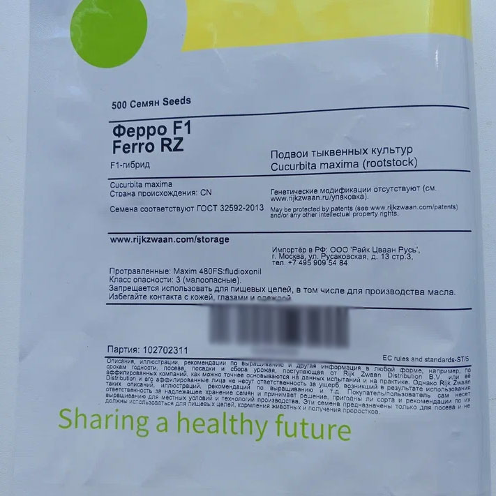 Ферро F1 - это межвидовой гибрид подвоя (C.maxima x C.moschata) от компании RIJK ZWAAN. Лидер продаж во многих странах. Рекомендован для огурца, дыни и арбуза. Дает очень высокую урожайность с высокой выровненностью плодов. Получен в результате скрещивания двух видов тыквы - крупноплодной и мускатной. Цвет плода:темно-зеленый. Цвет мякоти:зеленовато-белая.