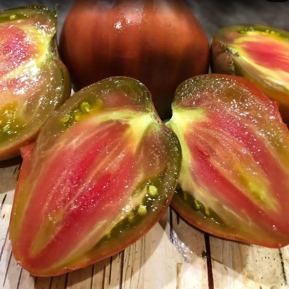 Среднеспелый, высокорослый, урожайный сорт томата. В средней полосе рекомендуем выращивать его в теплице. Растение индетерминантного типа, крепкое, высотой в конце сезона в закрытом грунте до 2-х метров. В кистях по 2-4 плода. Лист обычного типа. Плоды неправильной округло-сердцевидной формы с пышными плечиками. В стадии зрелости помидоры шоколадно-бордовые. На разрезе мякоть в середине малиновая, а ближе к краям желто-зеленая. В основном томаты 300-400 граммов, некоторые до 600 г. Вкус сладкий, немного пряный, без кислоты. Эти помидоры очень вкусны в свежем виде, но также подойдут для приготовления сока, соуса. Урожайность при соблюдении агротехники высокая – до 5 кг с 1 куста.