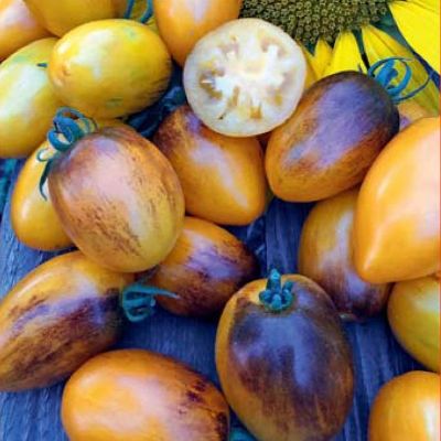 Редкий коктейльный сорт томата. Плоды небольшие сливовидной формы 50-100 г, жёлто-оранжевого цвета с антоциановыми полосами и сиреневым загаром. Очень красивый экзотический внешний вид. Вкусовые качества на высоте! Мякоть сочная, хрустящая, сладкая, с фруктовыми нотками. Учитывайте при посадке, что чем больше солнца - тем больше антоциана на томатах. Плоды хранятся в течение нескольких недель, устойчивы к растрескиванию.