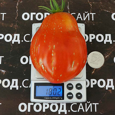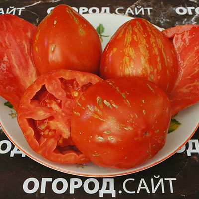 Высокий (1.8-2 м), мощный индетерминантный куст, усыпанный плодами необычной грушевидно-мешковатой формы, весом 150-250 г. Кожица красного цвета покрыта узором из золотистых крапинок и трещинок, которые многие принимают за болезнь или обычное растрескивание. Учёные из Университета Пизы официально подтвердили: светлые полосы – генетическая особенность, а не вирус. Его вкус – это томатная сладость практически без кислоты, с насыщенным ароматом и невероятно нежной, маслянистой мякотью под тонкой, нежной кожицей. Его предназначение – быть съеденным свежим. Нарежьте его в салат, на бутерброд или просто ешьте дольками. Из него получается нежная, сладкая и очень ароматная паста или соус.