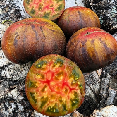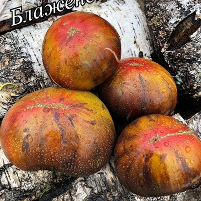 Семена редкого коллекционного сорта томата Блаженство селекции Софии Сааковой. Индетерминантный, высокорослый (высота кустов 1,8-2 м), среднеспелый, супер урожайный. Плоды высоко плоскоокруглые, яркого радужного мультиколорного окраса (цвета: бордовый, изумрудный, охровый и фиолетовый) с красивейшим лиловым антоцианом на плечиках, средний вес 200-500 г, очень вкусные, сладкие, сочные с маслянистой плотной тающей зелено-малиновой мякотью с фруктовым привкусом. Сорт очень урожайный, болезнеустойчивый, с длительным плодоношением, назначение салатное. Очень сладкий и красивый томат. Сорт молодой, еще возможны расщепления.