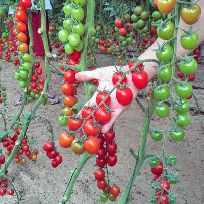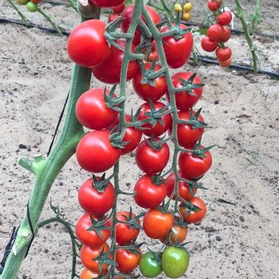 Томат черри Ликопа F1 - ранний, индетерминантный гибрид томата кистевого типа. Растение среднерослое, в тепличных условиях растение может достигнуть высоты 2м, формируют в 1-3 стебля. От всходов до первого сбора плодов 90–95 дней. В кисти в среднем 8–10 плодов. Помидоры яйцевидной формы, ярко-красные, массой 35-40 г. Мякоть очень сладкая с повышенным содержанием ликопина, вкус великолепный. Собирают как укороченными кистями, так и отдельными плодами. Урожай с куста до 5-6 кг. Урожайность 12–14 кг/кв.м. Плоды универсального назначения. Используют для свежего потребления и цельноплодного консервирования, прекрасно подходят для свежих салатов, украшения блюд, соленые не теряют форму, отлично смотрятся на праздничном столе. Рекомендуется для выращивания в защищенном и открытом грунте с подвязкой к опоре. Томат устойчив к вирусу томатной мозаики, вертициллезу и галловым нематодам, вирусу желтого скручивания листьев.
