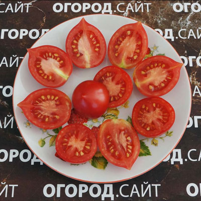 Сорт детерминантный, очень урожайный. Срок созревания среднеранний. Высота растения: 0,7-1,2 метра. Помидоры овальной формы с острым носиком, иногда чуть плоские с боков, яркого малинового цвета, массой 40-90 грамм. Плоды очень плотные, мясистые, хорошего сбалансированного вкуса. Лист обычный. Кисть компактная, 5-7 плодов, созревание дружное. Урожай можно снять за два подхода. Куст раскидистый, формирование минимальное. Созревшие помидоры не трескаются и не осыпаются. Болезнеустойчивость высокая. Отличная завязываемость после заморозка, в жару, в легком затенении. Отличный сорт для цельноплодной консервации.