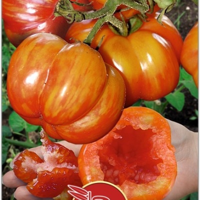 Томат Фаршировочный тигровый - это среднеспелый сорт (110-120 дней от всходов до плодоношения). Индетерминантный, высота растения, при выращивании в защищенном грунте, высота не ограничена. Первая кисть формируется после восьмого листа, каждая последующая через 3-4 листа. Кисть простая, состоящая из 5-7 одинаковых плодов. Форма плода кубовидная, с четко выраженными долями, красного цвета с желто-оранжевыми полосами, массой 120-130 г. Плоды в кисти созревают практически одновременно, что позволяет делать сбор кистями.