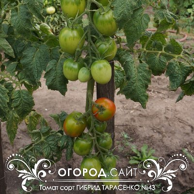 Томат Гибрид Тарасенко №43 созревает на 103 – 105 день с момента всходов. Предназначен для выращивания в открытом грунте в коловой культуре. Формируют этот сорт в 3 стебля, удаляя пасынки и старые нижние листья. Необходимо беречь кисти от заломов, поэтому примерно с 1-10 июля желательно их подвязывать или использовать для поддержки специальные крепления для кистей.