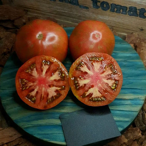 Высота куста до 1-1,2 м в открытом грунте, среднеспелый, лист морщинистый. Плоды крупные, плоско-округлые, с содержанием зелено-серебристых полос на красно-бордовом фоне. Масса плодов от 200 до 400 г. Мякоть плотная, мясистая, сочная, сбалансированного вкуса, с употреблением сахара и легкой кислинкой, с присущим ароматом. Урожайность высокая.