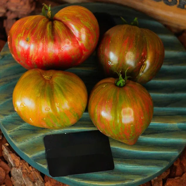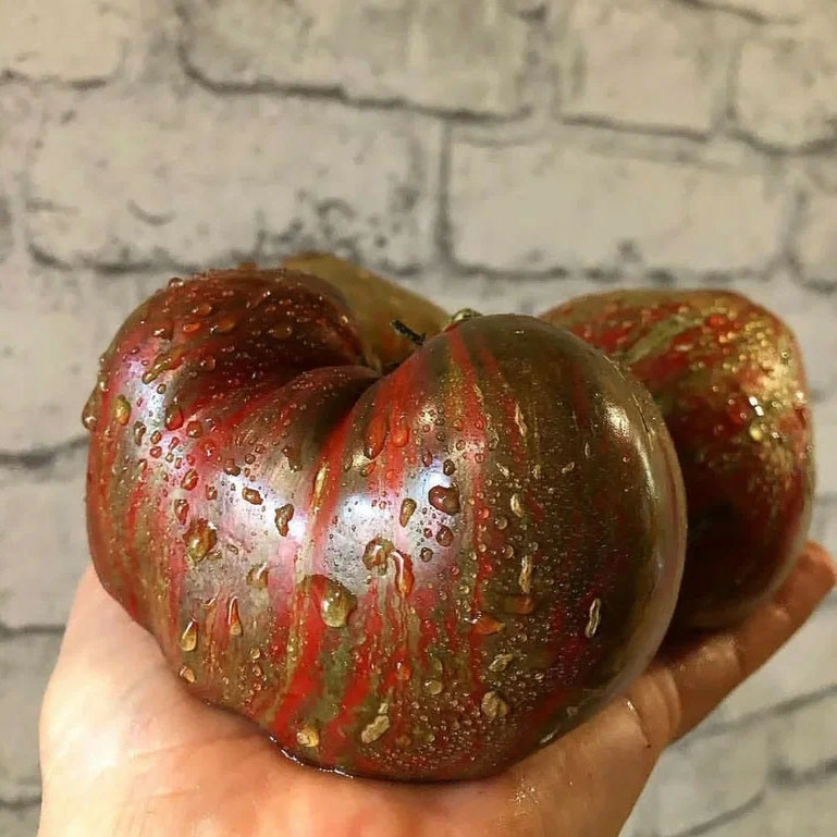 Томат из серии гном. Получился в результате скрещивания сортов Dwarf Wild Fred и Brad‘s black heart. Среднеспелый, невысокий, урожайный томат. Куст детерминантного типа, с широкими морщинистыми листьями. Высота куста до 80 см. Помидоры сердцевидные, в стадии зрелости пурпурные с зелеными с металлическим блеском полосками и штрихами. Средняя масса томата 100-250 грамм. Мякоть насыщенного бордово-малинового цвета, сочная и мясистая, имеет классический томатный вкус. Подходит для салатов и всех видов переработки. Сорт имеет длительное плодоношение.