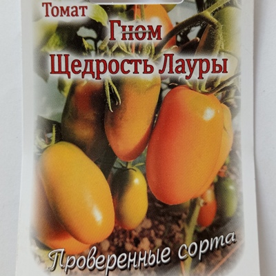 Томат Гном Щедрость Лауры – это коллекционный сорт. Крупные агрофирмы России семена этого сорта не выпускают. У нас на ТоматыПомидоры семена этого томата из частной коллекции. Упаковка зип пакет.