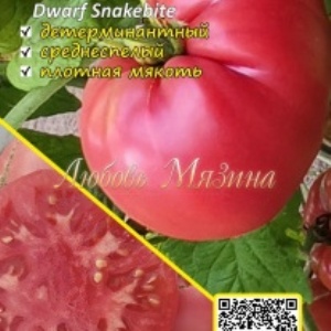 Томат Гном Укус Змеи - низкорослый крупноплодный сорт томата, красивый и урожайный, до 3 кг с одного растения, среднепоздний - 80 дней от высадки в грядку до созревания первых плодов. Карликовое растение, с крупными морщинистыми листьями, высотой до 70 см, в теплице - до 1 м. Плоды сочные, ароматные, яркого розового цвета, достаточно крупные по 100 - 250 г, сплюснутые, с пышными плечиками. Вкус - превосходный, сахаристо-фруктовый, освежающе-пряный, сочетает остро-терпкие нотки, мякоть плотная, густая, не водянистые, с прекрасным балансом сладости и кислинки. Плоды не растрескиваются, лежкость хорошая, снятые зелеными плоды хорошо дозревают. Для свежего потребления, на салат, соки, густые соусы. Устойчив к заболеваниям томатов. Он может быть успешно выращен как в открытом грунте, так и в закрытом – в пленочных теплицах, на балконе или как горшечная культура. Это делает данный сорт привлекательным для садоводов.
