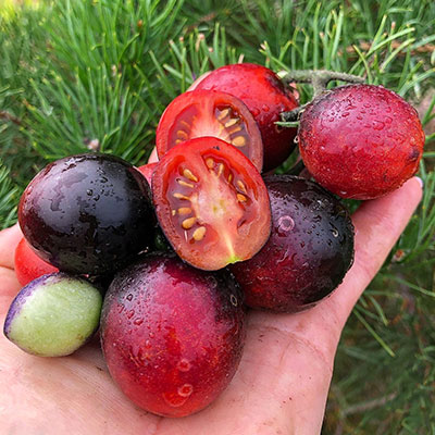 Томат Гном Вишня мокко (Dwarf Mocha's Cherry) - детерминантный, среднеспелый сорт с длительным периодом плодоношения. Отличается высокой урожайностью. Кусты компактные, плотные высотой до 60 см, с морщинистой листвой. Плодоносят длинными кистями. Плоды круглые коктейльного типа массой 20-30 г, малинового цвета с темными антоциановыми плечиками. Чем больше солнца, тем больше антоциана. Мякоть сочная, ароматная, с большим количеством сока. Вкус кисло-сладкий с фруктовыми нотками. Высокая устойчивость к болезням. Подходит для нарезки, салатов, консервации, вяления.