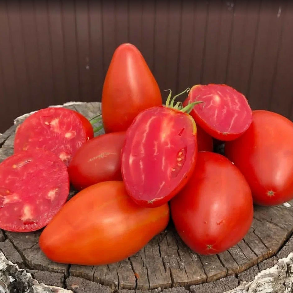 Среднеспелый, индетерминантный, очень урожайный сорт. Высота куста в теплице 1,7 м. Листья обычные, кусты средней густоты. Сорт конь-огонь: очень продуктивный, кисти веерные, большие. Плоды красивые, красные, вытянутые, различной формы: овальной, сердцевидной, сливовидной. Вес плодов 150-300 грамм. Мякоть малиновая, мясистая, сочно- маслянистая, сладкая с ноткой кислинки. Кожица тонкая. Плодоношение длительное, до конца сезона. Хорош для всего. Подходит для консервации, салата, соусов, сока. Сорт для теплиц и открытого грунта.