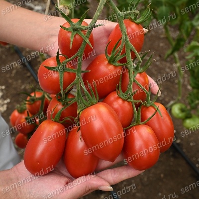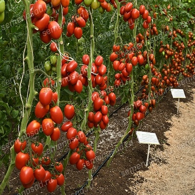 Томат Марина - высокопродуктивный гибрид с отличной завязываемостью плодов и одновременным созреванием плодов в кисти. Среднеспелый кистевой гибрид индетерминантного типа для выращивания в защищенном грунте. Требует подвязки и формирования. Период от всходов до созревания 115-117 дней. Растение компактное. В кисти 10-13 выровненных плодов яйцевидной формы, массой 70-80 г, ярко-красной окраски с глянцевым блеском и плотной кожицей. Обладают ярким насыщенным вкусом и ароматом. Отлично подходит для цельноплодного консервирования.