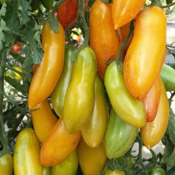 Когда приходит время созревания, то томат Медовые пальчики F1 просто горит на солнце своими яркими плодами. Они медовые, с оттенком розового цвета. Полностью созревший помидор украшен оранжевыми полосками. Форма плодов удлинённая, достаточная для того, чтобы их назвали пальчики. Каждый помидор украшен маленьким носиком, который легко рассмотреть на фото. Томаты второй волны созревания немного поменьше и имеют вес в пределах 60 грамм. При поперечном разрезе видно две или три семенные камеры. Купить томат Медовые пальчики можно в нашем интернет-магазине.