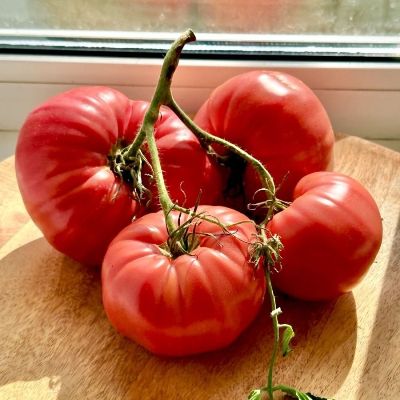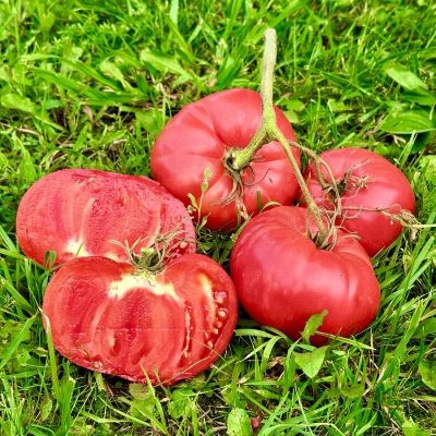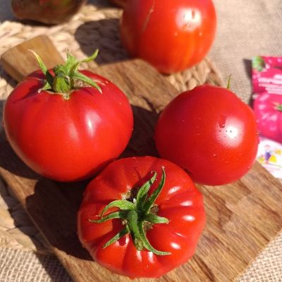 Плоды первых кистей особо крупного размера, весом до 1 кг, способны накормить вкусным салатом целую семью! Сорт среднеспелый, светолюбивый, хорошо плодоносит в открытом грунте, не любит теплиц. Урожайность до 10 кг/м2. Растение среднерослое, высотой до 1,5 м. Плоды гладкие, округло-плоские, красно-малинового цвета, плотные, с сахаристой мякотью и малым количеством семян, устойчивые к растрескиванию. Сорт отзывчив к поливу и регулярным подкормкам комплексными удобрениями, чувствителен к недостатку бора и калия в почве.