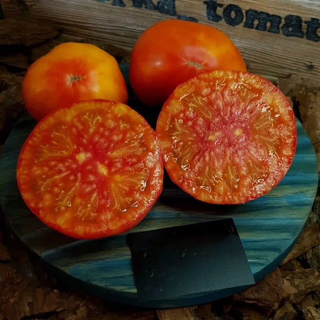 Прозорливый Колдун - высокий, среднепоздний, очень урожайный. Высота куста около 1.5 м. Плоды красивые, грушевидной формы, с ребрышками вокруг плодоножки, плотные, оранжево-розовые снаружи и внутри, весом 170-360 гр. Очень мясистый с «мраморной» мякотью, сочный, многокамерный, семян очень мало. Аромат обычный, помидорный, очень приятный вкус, сладкий с кислинкой. Назначение салатное.