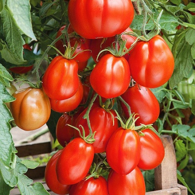 Очень урожайный, индетерминантный гибрид с необычной грушевидной, слегка ребристой формой плодов. Помидоры крупные, весом 200-250 (до 600) г, насыщенного красного цвета с плотной, мясистой мякотью сладкого вкуса. Плоды отлично хранятся снятые бланжевыми; не портятся 2-3 месяца даже при комнатной температуре. Растения высокорослые, стойкие к похолоданиям и большинству болезней. Из-за высокой нагрузки плодами подвязка обязательна.