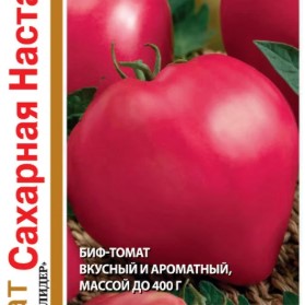 Томат Сахарная Настасья - растение среднерослое (до 150 см), подходит для выращивания в пленочных теплицах или в открытом грунте, если подвязывать к кольям. Урожай можно снимать на 120-130 день после появления всходов. Розовые, а затем почти малиновые сердцевидные плоды такие крупные, что не помещаются в руку (до 400 г), к тому же содержат мало семян. Мякоть с концентрированным томатным вкусом, медовая, аромат просто потрясающий. Сорт исключительно салатного назначения.