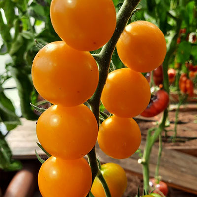 Томат Саммер сан - это индетерминантный высокорослый сорт. Крепкие побеги вырастают до 2 м и выше. Требуют прищипки и пасынкования. На кустах образуется 15-18 плодоносных кистей, на каждой завязывается по 7-8 помидорок-крошек. Средняя масса помидоров 25-30 г, окраска янтарно-золотистая. Мякоть мясистая, неводянистая, сахарная. Вкус сладковатый, с фруктовыми нотками и легкой кислинкой. Красочные, янтарные, отблескивающие на солнышке плоды отличаются полезным составом – в них много каротина, антиоксидантов и ликопина. С 1 куста собирают 2-3 кг, с 1 кв.м до 6-7 кг.