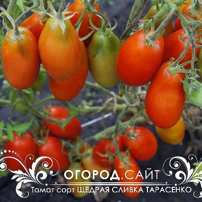 Томат Щедрая сливка Тарасенко - индетерминантный, высокорослый, урожайный сорт. Высота куста до 3-х метров. Плоды завязываются кистями. Помидоры вытянутой формы, плотные, в спелом виде — красного цвета, весом около 80 грамм. Идеально подходят для вяления и засолки, так как мякоть малосочная.