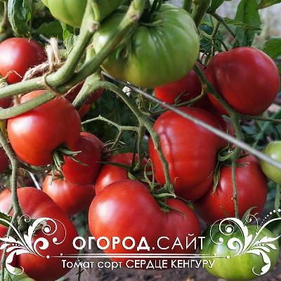 Томат Сердце Кенгуру - индетерминантный куст высотой по 1,8-2 м. Листья обычные, растение мощное и крепкое. Срок созревания средний или среднеранний – минимальный срок, который занимает созревание, это 110 дней после первых ростков. Плоды имеют округло-сердцевидную форму, за что сорт и получил свое название. Их цвет красный или темно-красный. Масса составляет от 300 до 600 г в зависимости от ухода. Внутри много камер с семенами, мякоть очень вкусная, сочная, мясистая. Сорт подходит для любого потребления, кроме цельноплодного консервирования.