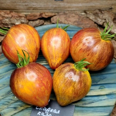 Томат Сладкая Карамель Софии - редкий коллекционный сорт. Сорт - фантастический шедевр красоты, выведен Софией Сааковой. Индетерминантный, высокорослый (1,8-2 м), среднеспелый. Плоды сердцевидно-удлиненные биколоры с гранями и вытянутым носиком, яркого пестрого окраса с красивейшим лиловым антоцианом на плечиках, средний вес от 150 до 300 г, очень вкусные, сладкие, сочные с маслянисто - мармеладной тающей мякотью и фантастическими разрезами. Семян в плодах очень мало, в некоторых плодах нет совсем. Сорт очень урожайный, болезнеустойчивый, с длительным плодоношением, салатного назначения. Сорт молодой, еще возможны расщепления.
