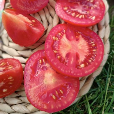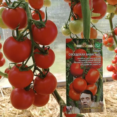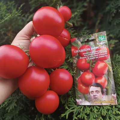 Томат Соседская зависть F1 - раннеспелый, высокоурожайный, индетерминантный, кистевой томат для выращивания в теплицах. В южных регионах его высаживают на открытые грядки, без укрытия. Срок созревания, с момента появления всходов до полной зрелости, 85–95 дней. Куст высокорослый, требует подвязки к опоре и пасынкования, формируют куст в 2 стебля. На каждой кисти завязывается до 12 помидорчиков, весом, около, 100 г. Урожайность высокая, при размещении на 1 кв. м грядки 3-4 саженцев, собирают до 17 кг плодов. Томаты ярко-красные, плоско-округлые. Мякоть сочная, вкус сладкий с ощутимой кислинкой. Благодаря плотной кожице плоды универсальны в применении, не боятся термической обработки. Употребляют в свежем виде, для засолки и цельноплодного консервирования. Созревание дружное, томаты не растрескиваются от перезревания и сохраняют товарный вид в течение месяца, выдерживают транспортировку на длительные расстояния без потери внешних и вкусовых качеств. Гибрид устойчив к основным заболеваниям.