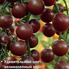 Удивительный цвет, великолепный вкус, сладкие черри. Сладкое лакомство, для цельноплодного консервирования. Для защищенного грунта. Раннеспелый гибрид. Период от всходов до начала плодоношения 90-95 дней. Растение высокорослое до 200-250 см. В кисти по 13-18 плодов. Плод округлый, фиолетово-коричневой окраски, массой 18-22 г, кисло-сладкого десертного вкуса, с тонкой кожицей. Мякоть плотная, с характерным привкусом, отлично подходит для употребления в свежем виде. Идеален для цельноплодного консервирования. Устойчив к болезням.