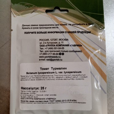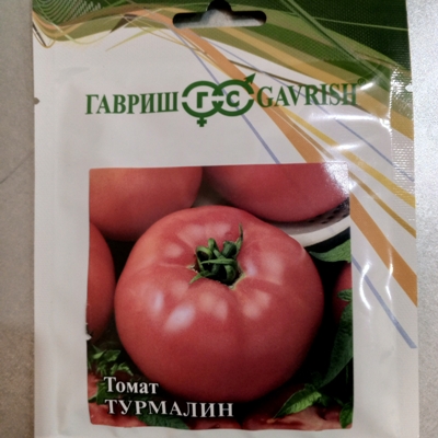 Томат Турмалин - раннеспелый сорт. Растение детерминантное, мощное, среднерослое, полураскидистое, средневетвистое и среднеоблиственное. Лист обыкновенный, среднего размера, зелёный, среднегофрированный, соцветие простое с 3-5 цветками. Плод плоско-округлый, среднеребристый, среднеплотный, 6-8 гнездный, массой 130-150 г, незрелый - зелёный, зрелый - розовый. Благодаря отличному вкусу прекрасно подходит для свежих салатов и переработки на томатопродукты. Сорт отличается высокой товарностью плодов.