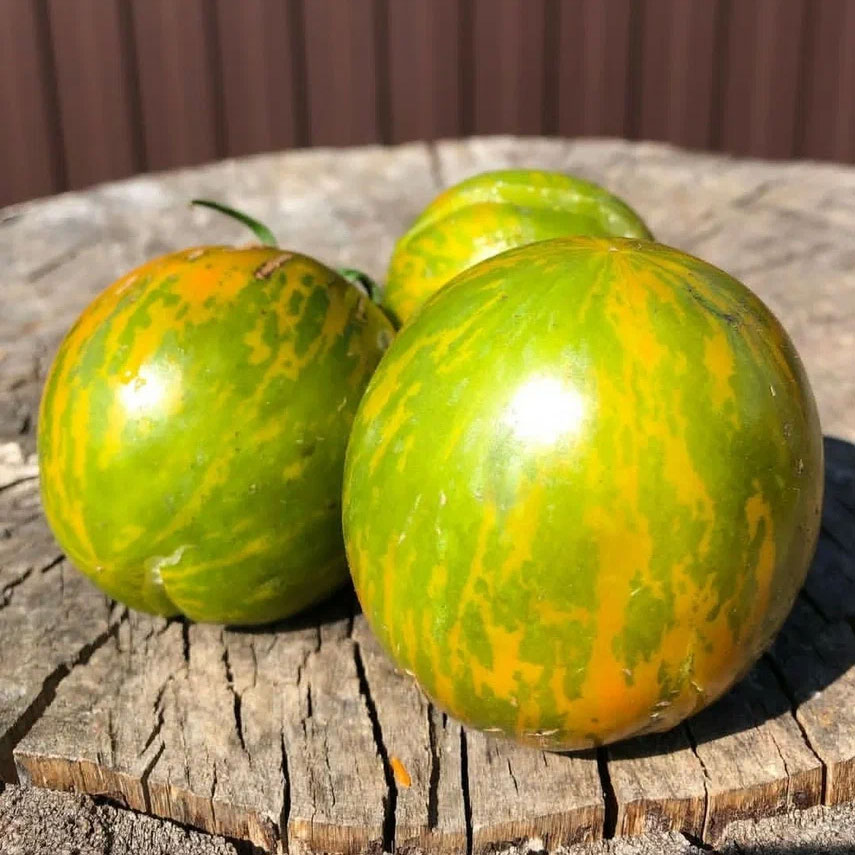 Созревшие плоды насыщенного зеленого цвета с темно-зелеными полосками и штрихами. Масса помидорок 60-100 грамм, форма круглая, ароматный фруктовый запах, отличный вкус. Очень нарядный внешний вид! Вкусные для салатов, а так же в любой томатной консервации.