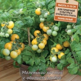 Томат Желтая шапочка - сорт помидоров-черри для выращивания в контейнерах или на балконе. Аккуратный декоративный куст усыпан миниатюрными золотисто-желтыми плодами. Помидоры круглой формы, по 15-20 грамм. По степени созревания — ранний сорт, после большинства всходов проходит всего 80 — 90 дней до момента сбора урожая. Имеет высокую степень устойчивости к табачной мозаике, вертициллезу, фузариозу. Не успевает заболеть фитофторозом из-за быстрого плодоношения.