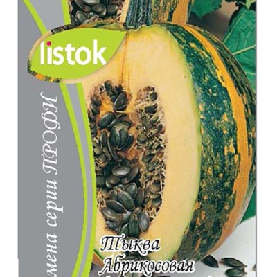 Тыква Абрикосовая - уникальный среднеранний сорт. Плод округлоцилиндрический, слегка ребристый. Зрелый плод желтый с широкими темно-зелеными, пятнистыми полосами. Кора тонкая, твердая. Мякоть светло-желтая, слабоволокнистая. Семена без твердой оболочки. Предназначен для употребления в сыром виде, в кулинарии и получения семенной продукции.